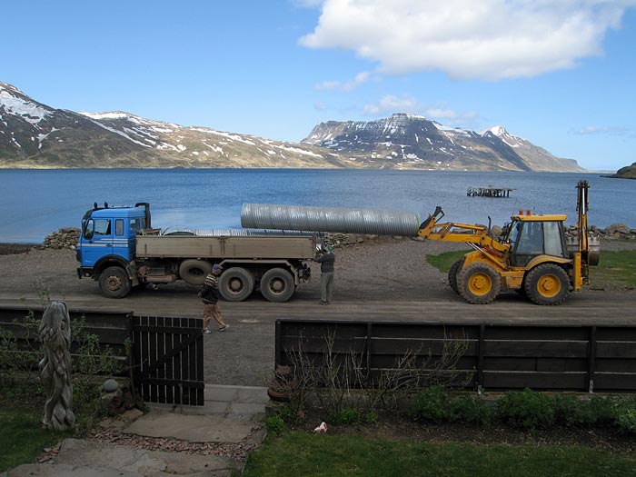 Djúpavík. Baustelle 1: Abwasserrohe werden geliefert.