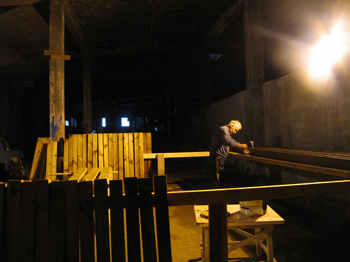 Djúpavík. Bearbeitung des Holzes für den neuen Balkon am Hotel.