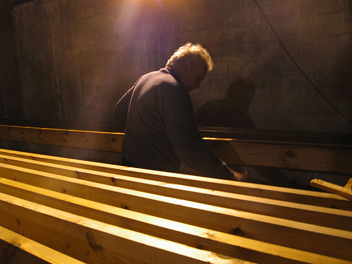 Djúpavík. Bearbeitung des Holzes für den neuen Balkon am Hotel.
