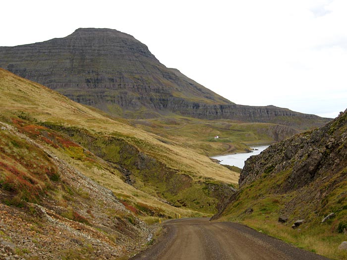 Reykjarfjörður. Blick auf das Sommerhaus Naustvík, dahinter der Berg Sætrafjall.