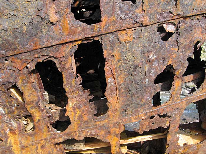 Djúpavík. Die etwas rostige und undichte Schiffswand der M/S Suðurland.