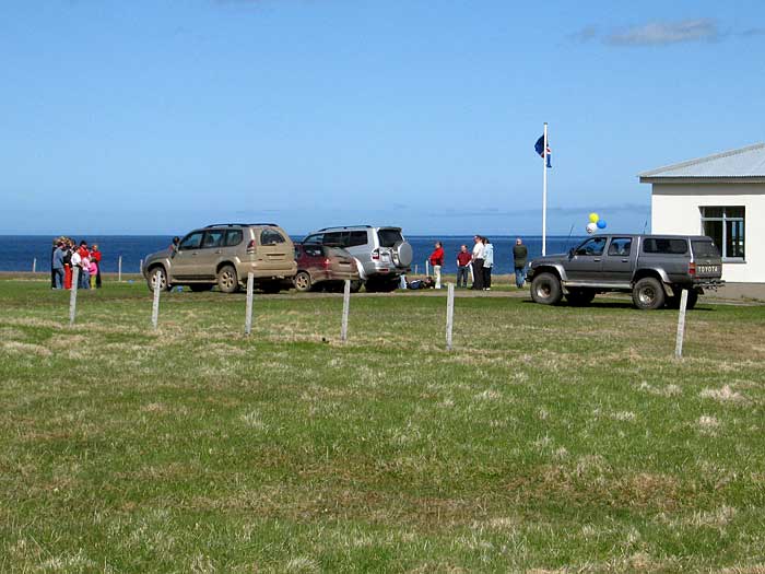 Djúpavík. Wanderung. Wir haben unser Ziel erreicht: das Gemeindehaus. Hier wird der Natinalfeiertag gefeiert.
