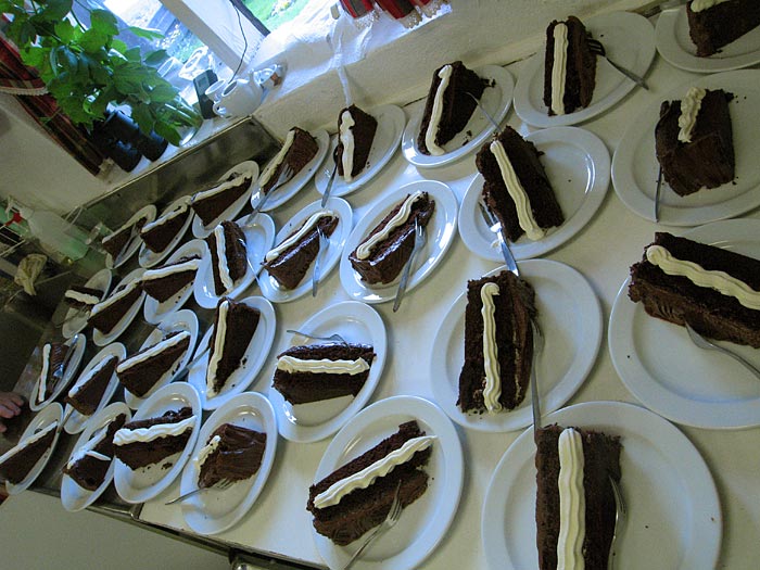 Djúpavík. 50 Gäste. 50 Stück Schokoladenkuchen, mit Sahne - hier nur eine Auswahl.