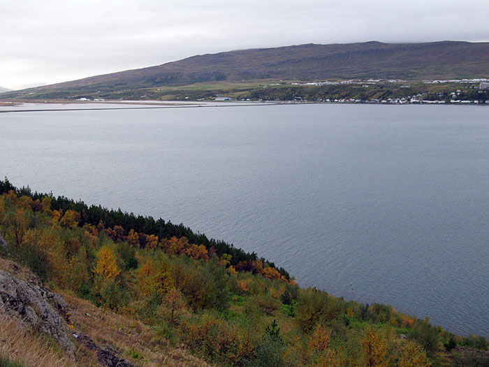 Akureyri. Blick über den Fjord Eyjafjörður auf Akureyri. Und Bäume hat es hier recht viele (Herbst!).