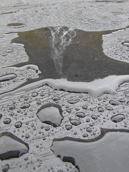Djúpavík. Wasser und Wasserfall auf der Dachpappe.